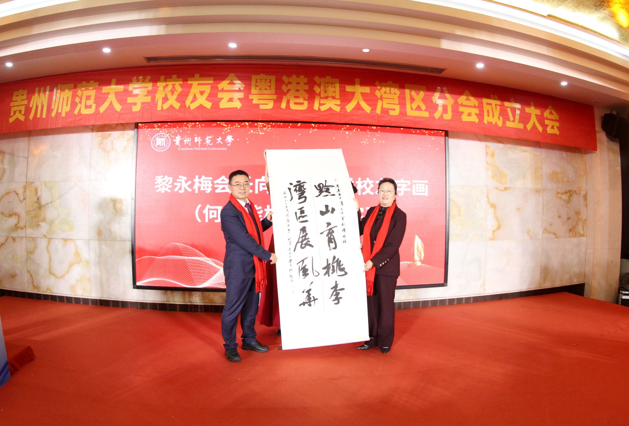 会上,黎永梅受学校1991届中国画专业校友何德能先生委托,代为向母校赠送其亲笔创作的字画作品,以此寄托对母校的殷殷情谊;贵州大学深圳校友会、贵州财经大学深圳校友会向我校校友会粤港澳大湾区分会赠送字画作品,彰显兄弟高校校友间的深厚情谊。